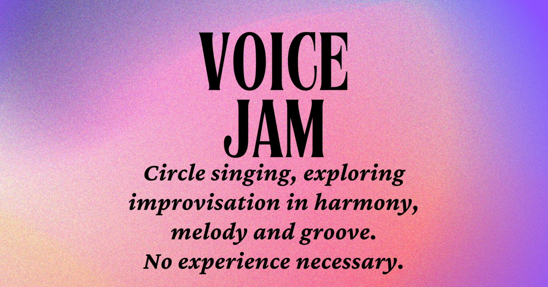Voice Jam sessions are an adventurous, off piste exploration in groove, melody and harmony. We will improvise loops, build harmony, take flight in solos, talk gibberish and listen deeply.The sessions will give each of us time to explore the edge of our vocal ability, whilst feeling the support of the whole group. In voice jam there are no mistakes, just bring your childlike playful self and dive in.